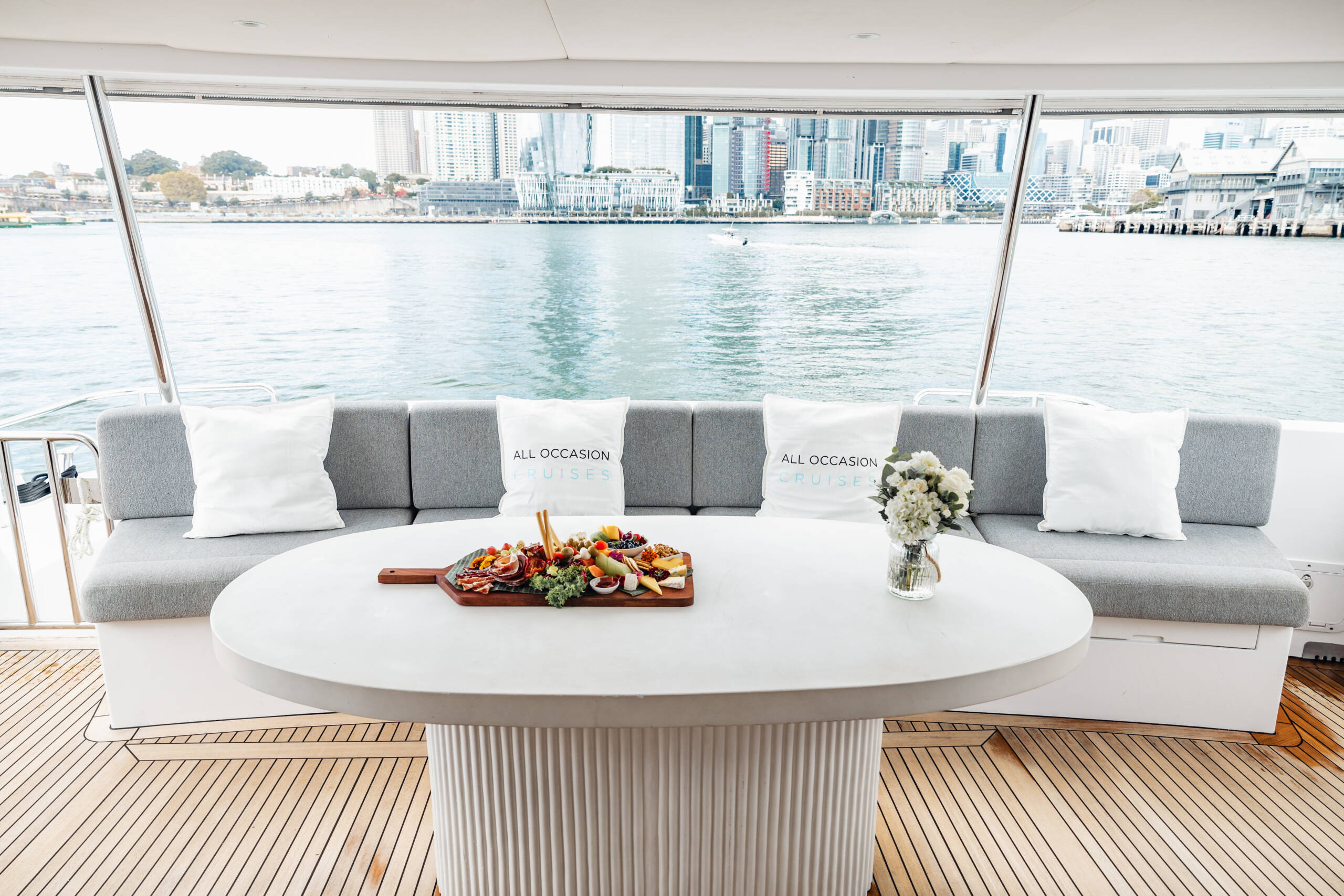 AQA Luxury Boat Charter rear deck includes a 10 seat dining table giving that feeling of an open restaurant. Her sophisticated interior can be used for formal dining up to 40 guests or left unchanged to remain as a luxurious lounge area. The top deck boasts panoramic views of Sydney Harbour and can be designed to create a formal alfresco dining experience.