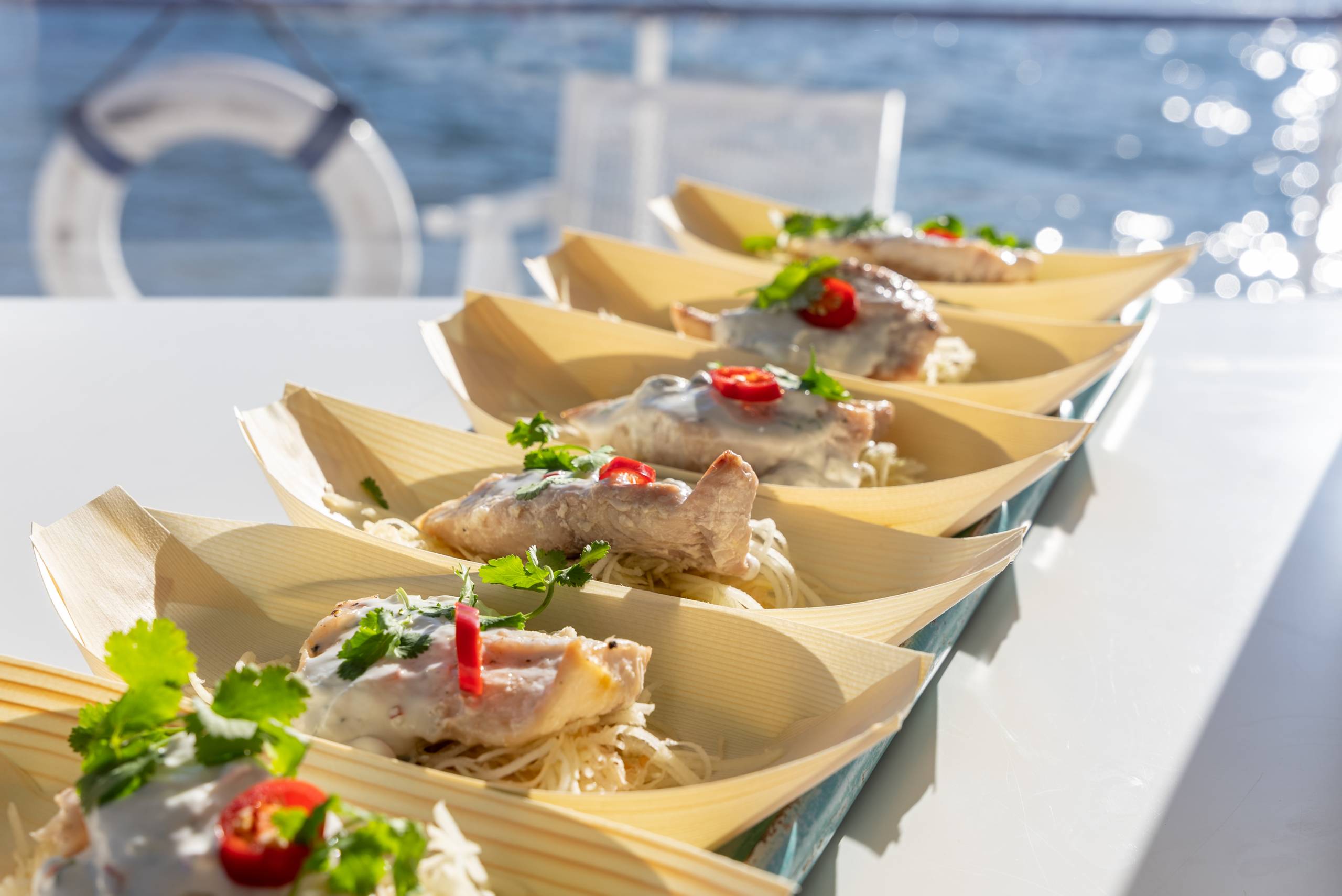 There will also be an additional $600 charge for kitchen/preparation staff. This fee includes our in-house team plating, presenting and serving food brought onto the vessel, including reheating items that need to be re-warmed (oven use only). We will also supply all service platters, service utensils and disposable plates/cutlery/napkins.